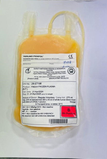 This product is required for patients suffering from bleeding disorders. SRKRC staff prepares random donor and single donor platelets (SDP). SDP are obtained on Cell Separator machine using apheresis procedure.